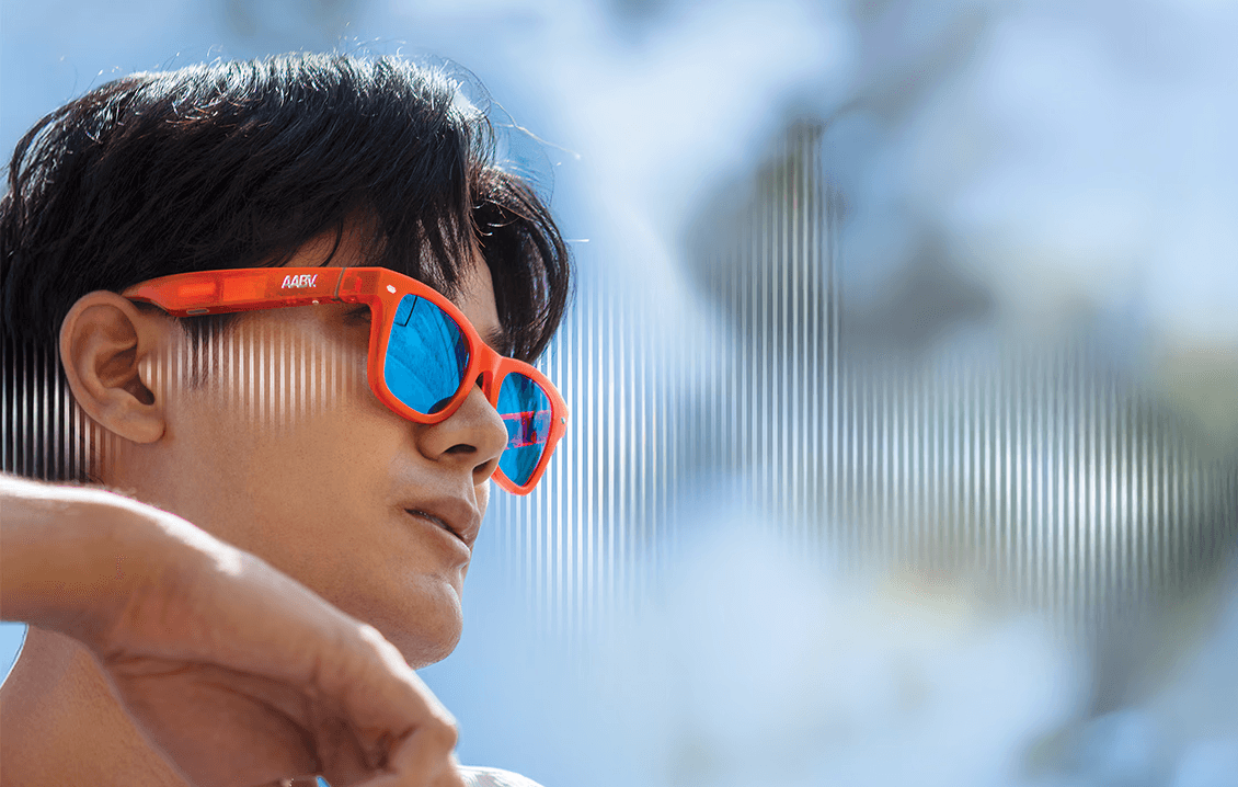 Lightweight TR90 frame, open-ear audio, MEMS mic, 8-hour battery life, and fully customizable design for brands and private label partners.